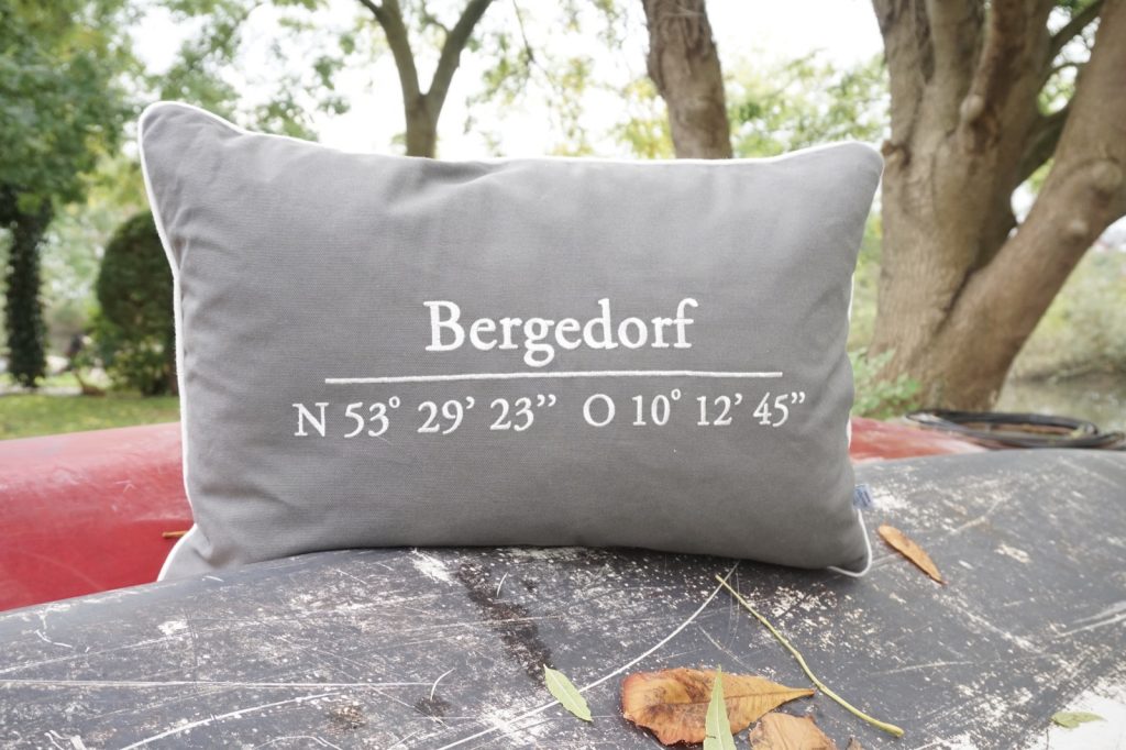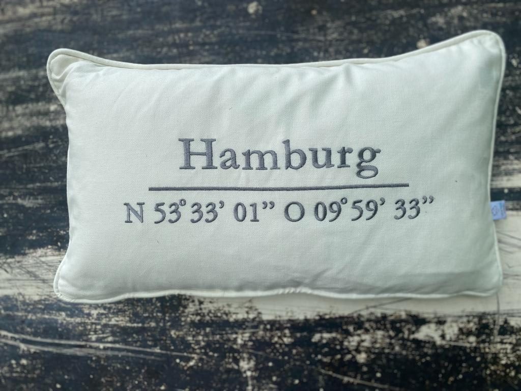 Kissen mit Wunschkoordinaten ab 79,00 € incl. Füllung – Leinen oder Baumwolle Ort, to Huus, to Hus, Tohuus, Heimathafen, Ankerplatz oder…..